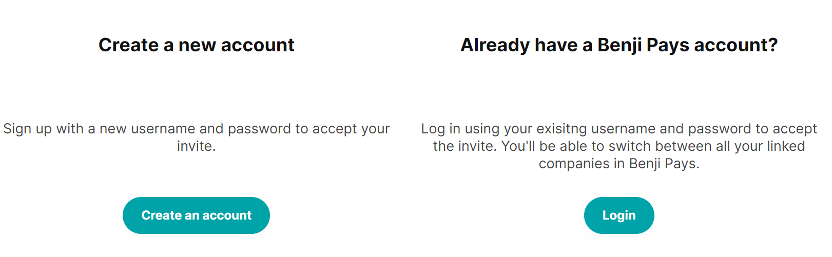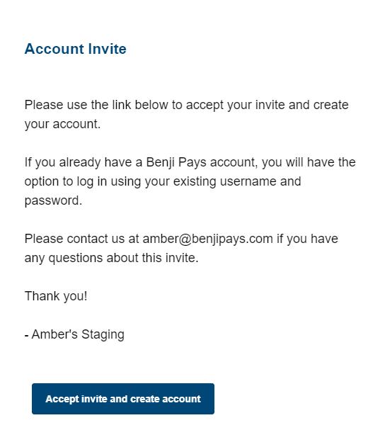 The invited user will receive an email invite( Please see screenshots below), granting them access to create their personal login account. If the invited user already has a Benji Pays account with another company, they can accept the invitation using their existing credentials. In Benji Pays, they can conveniently switch between linked companies.