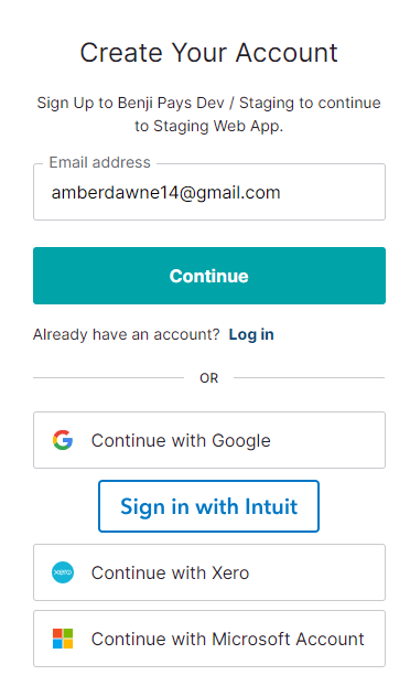 Create your account with your email address or choose your Intuit QuickBooks login details to save you from creating a separate login for Benji Pays.