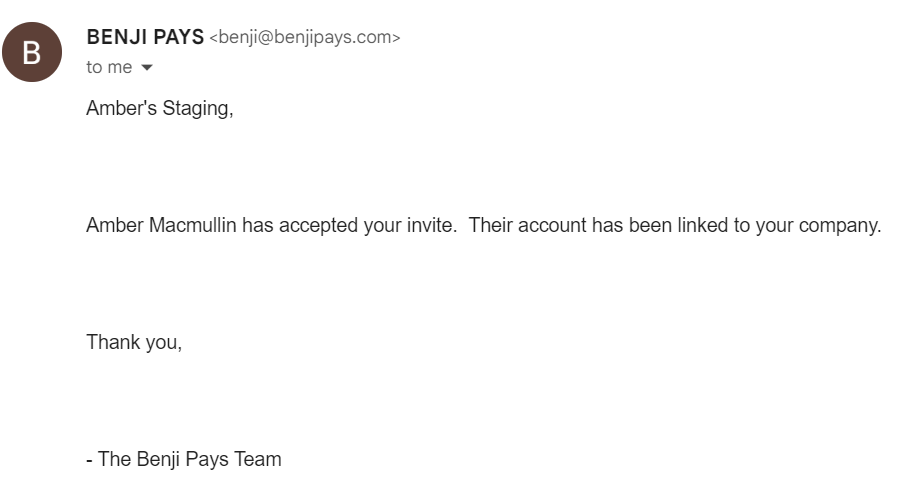 This is an example of the email you will receive once the user accepted the invite and their account has been linked to your company