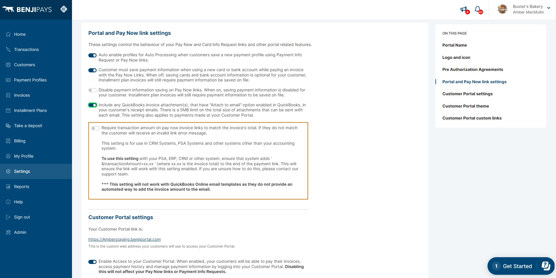 Step 2: Scroll down to " Portal and Pay Now link settings". Toggle on "Include any QuickBooks invoice attachment(s), that have "Attach to email" option enabled in QuickBooks, in your customer's receipt emails. There is a 5MB limit on the total size of attachments that can be sent with each email. This setting also applies to payments made at your Customer Portal.