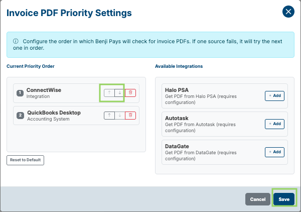 Once saved, scroll to the bottom of the Integrations page and set your Invoice PDF Priority.Click Configure PDF Priority.