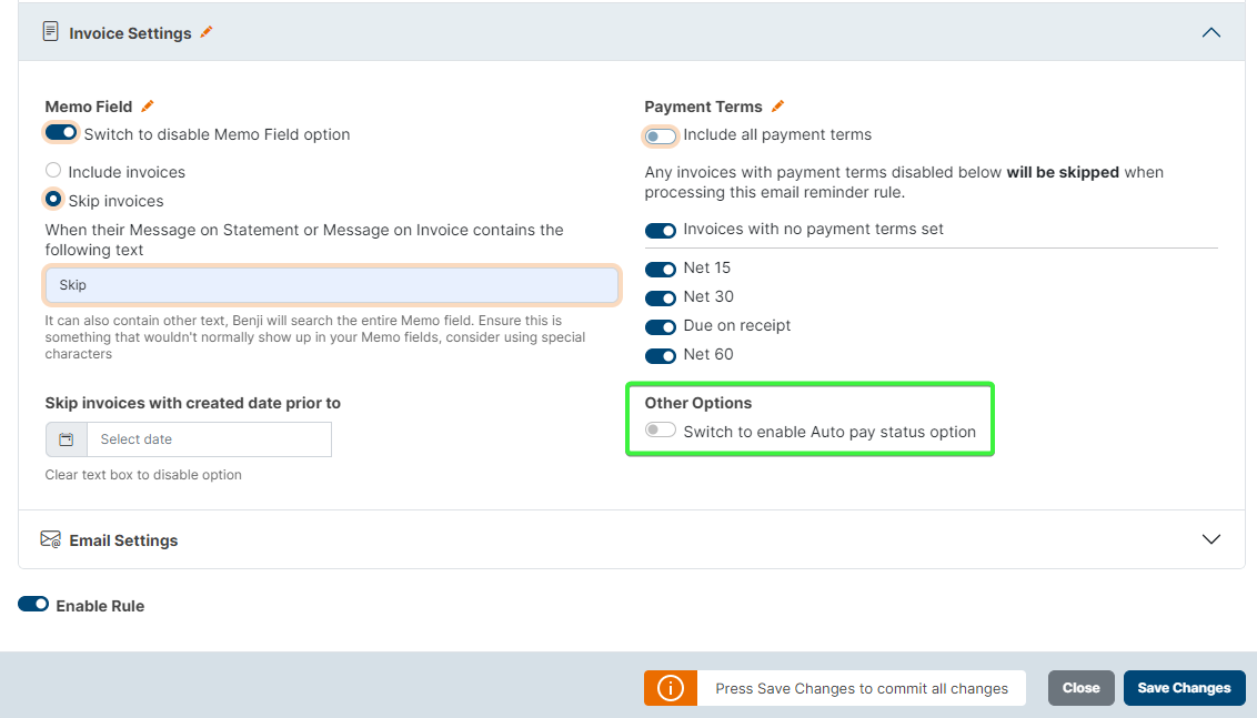 Enabled: You can choose to only send when auto pay is enabled. Invoices will only send if the customer is enabled for auto pay and the invoice matches auto pay rules.