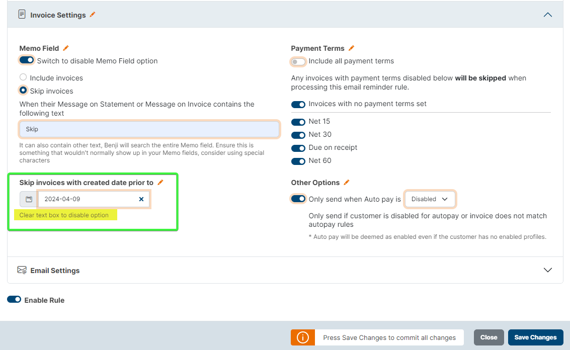 Step 12: With the "Skip Invoices with created date prior to" feature, it allows you to avoid sending invoices generated before a specific date you set. To disabled this function, simply leave the date box empty.