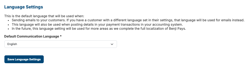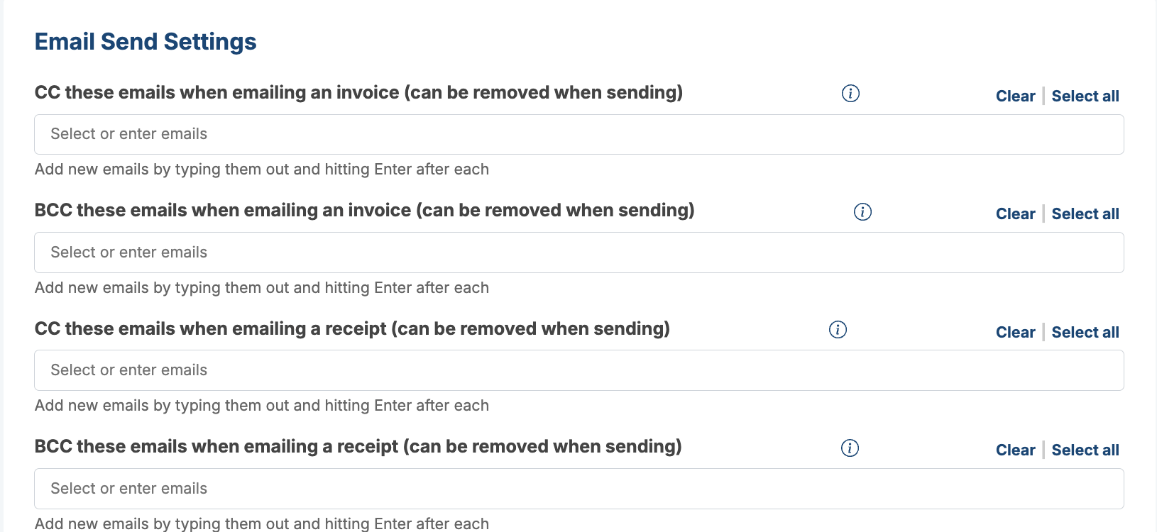 This section allows you to set default CC and BCC recipients for invoices and receipts sent from Benji Pays. Any email addresses added here will automatically be included when sending, but can be removed before the email is sent.