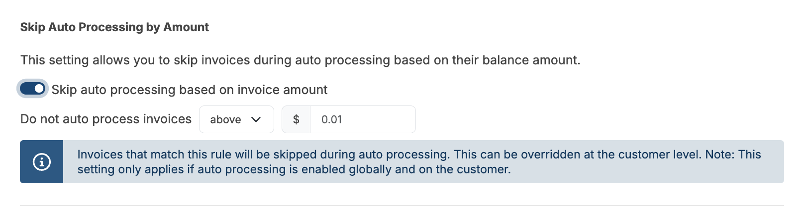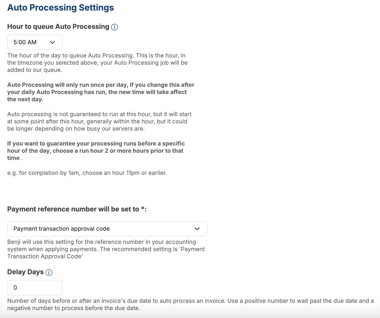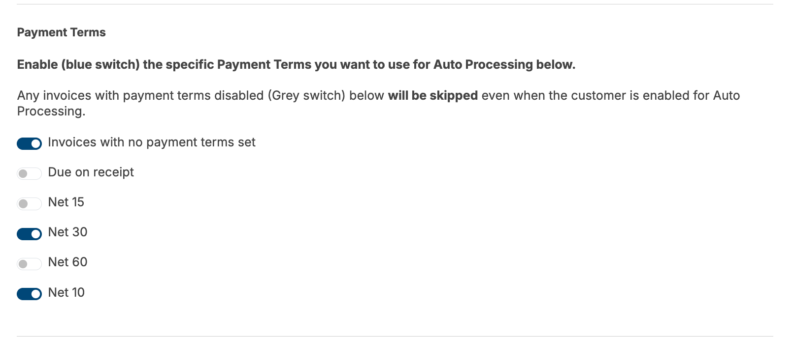 If you plan to use Auto Processing, there are two ways to exclude specific invoices by using either the Memo Field (QuickBooks only) or Payment Terms (referred to as Branding Theme in Xero) to prevent them from being auto-processed. You can also select the date from which auto-processing will begin automating payments for invoices based on their invoice date.