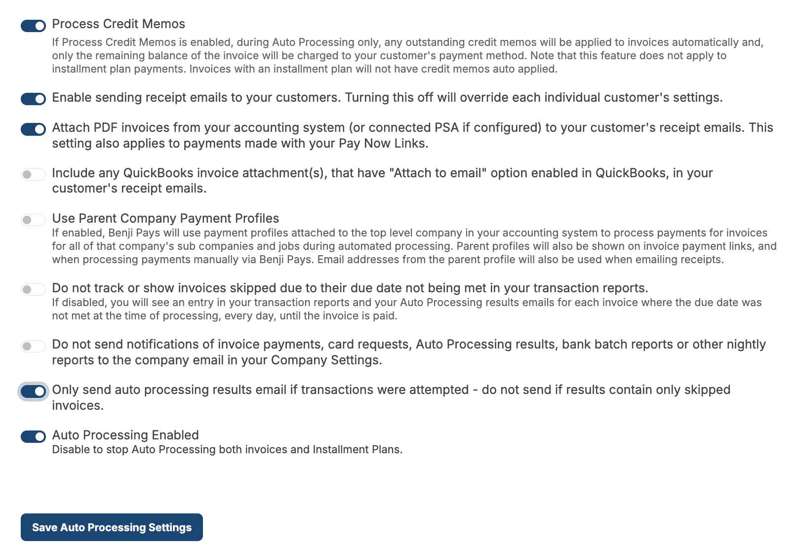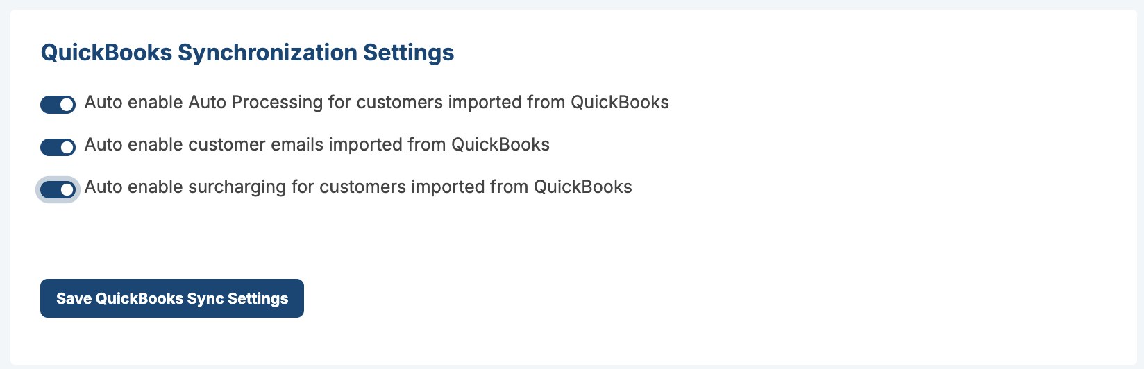 We recommend having all three settings enabled by default. These settings ensure that when you create a new customer in your accounting system, their data syncs with Benji Pays. This includes enabling customer-level auto-processing, importing their email address, and allowing them to be subject to surcharges on future invoices.