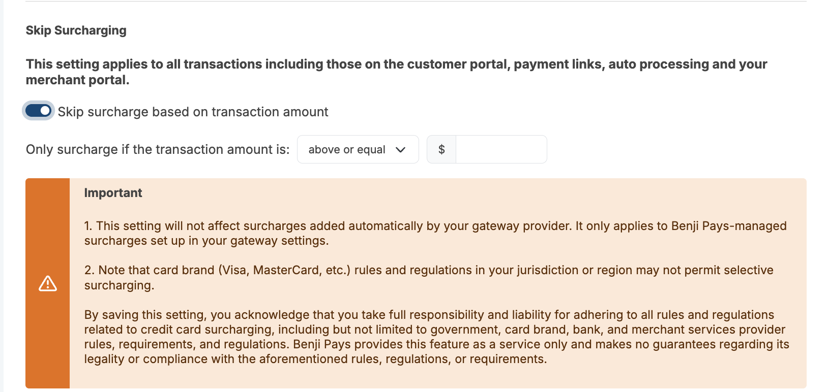 This setting is optional and allows you to choose whether to skip applying a surcharge based on the transaction amount.