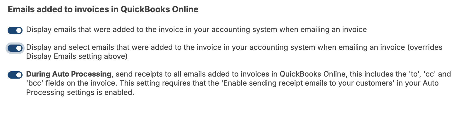 These settings control whether email addresses entered on invoices in QuickBooks Online (including To, CC, and BCC) are shown, selectable, and used when sending invoices or receipts from Benji Pays. They also determine whether those same QuickBooks invoice email addresses receive receipt emails automatically during Auto Processing.
