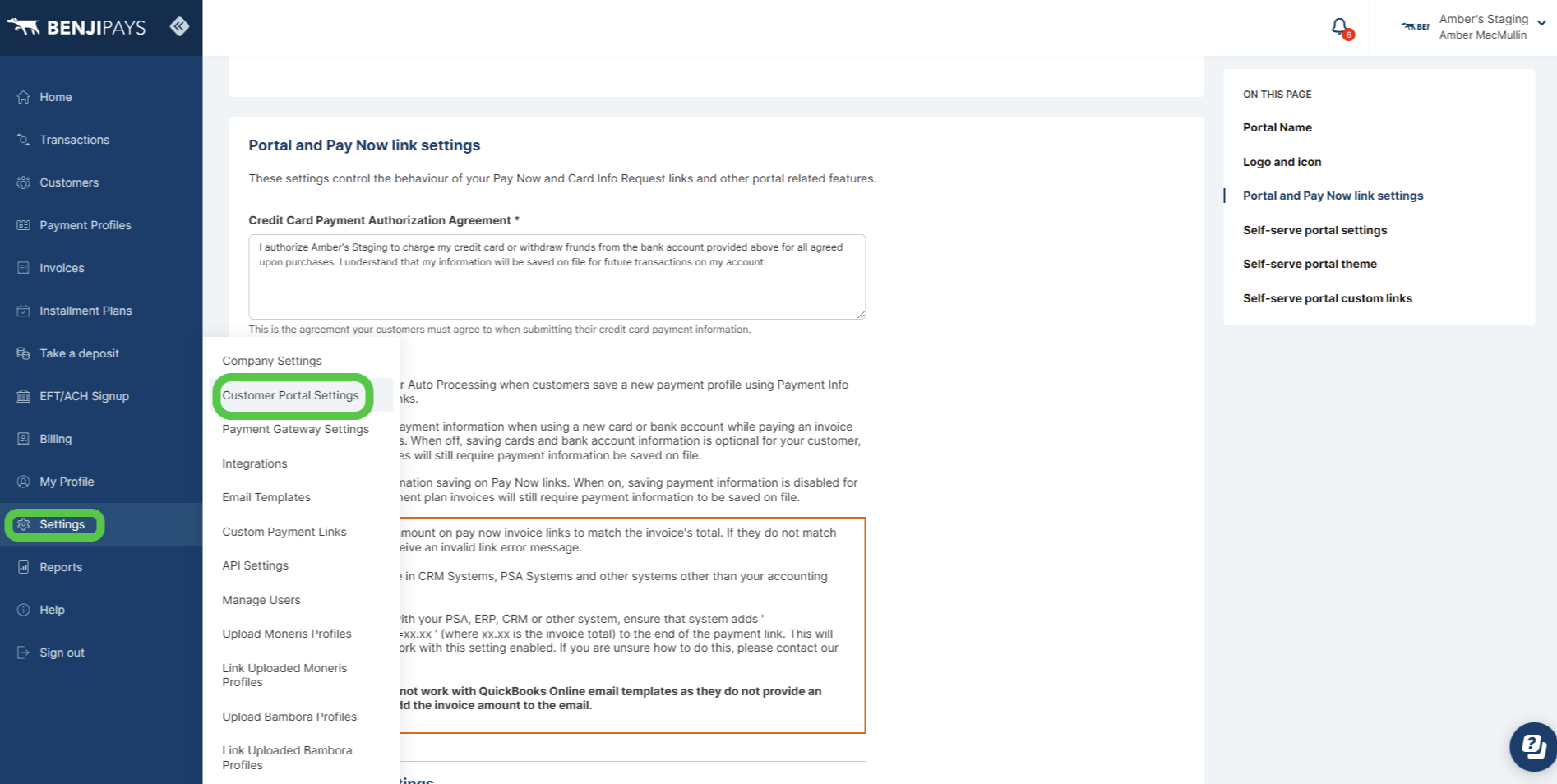 Step 4: In Benji Pays, navigate to "Settings > Company Settings" and scroll down to the "Customer Portal Settings" section.