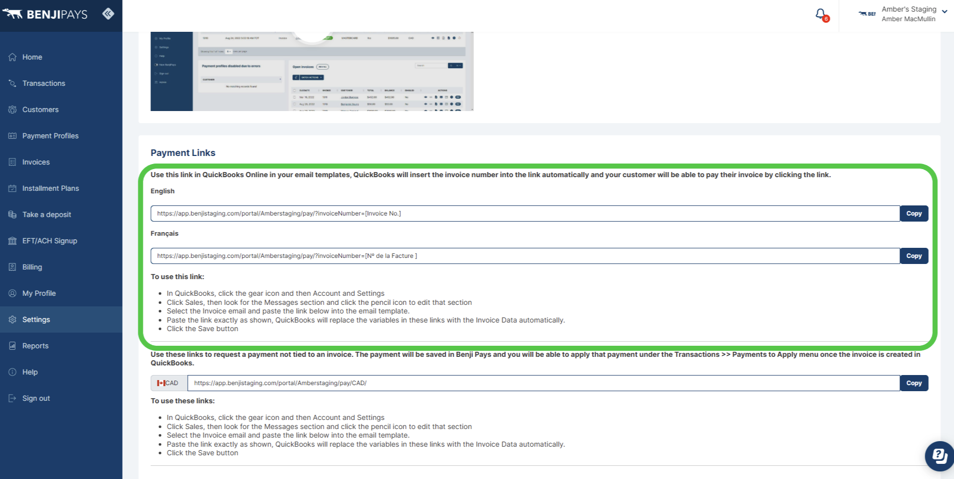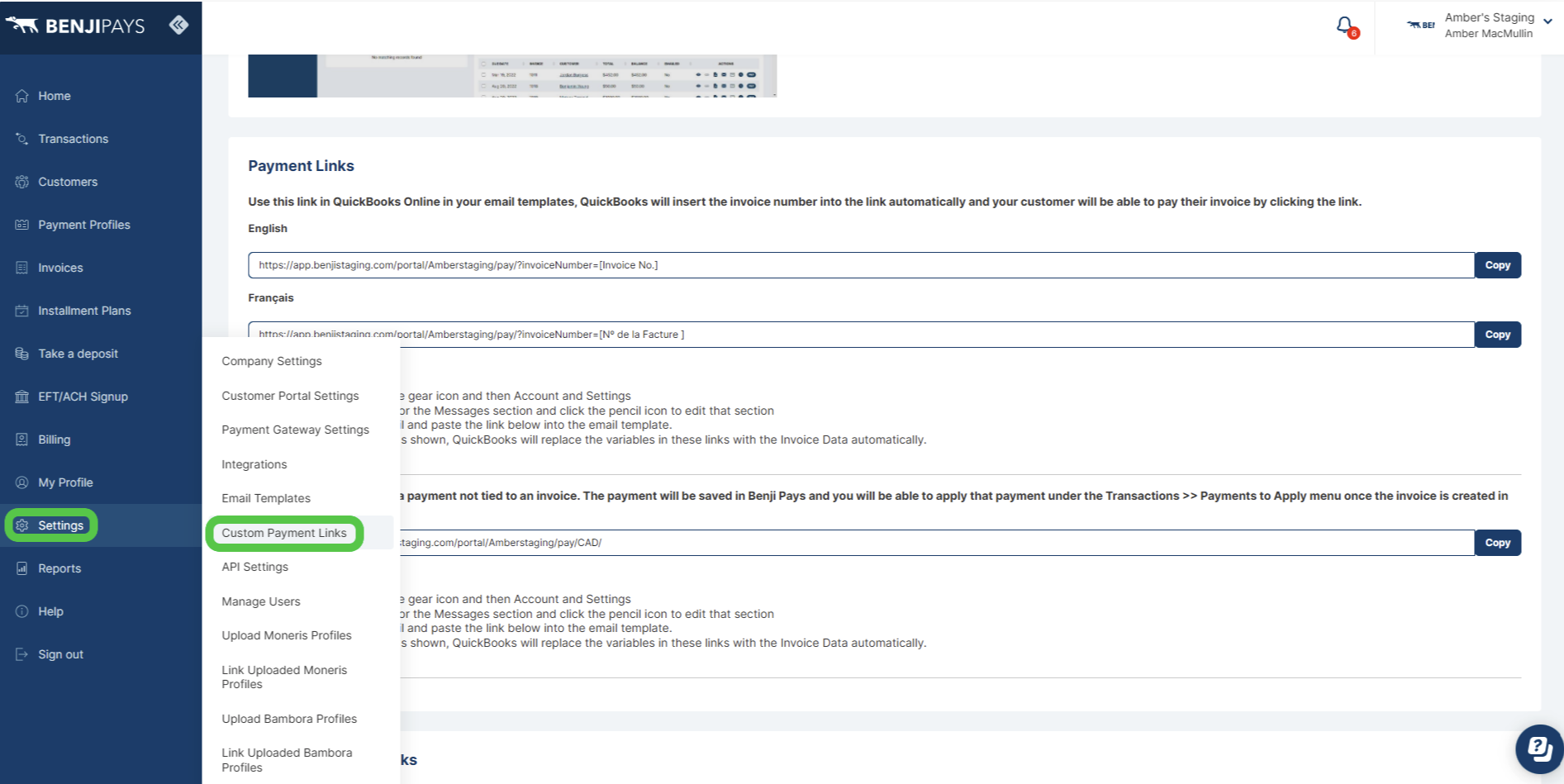 Step 6: In Benji Pays, navigate to "Settings > Custom Payment Links".