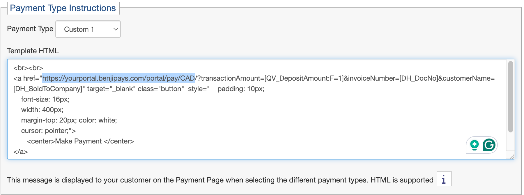 Paste the HTML into the Payment Type Instructions box.