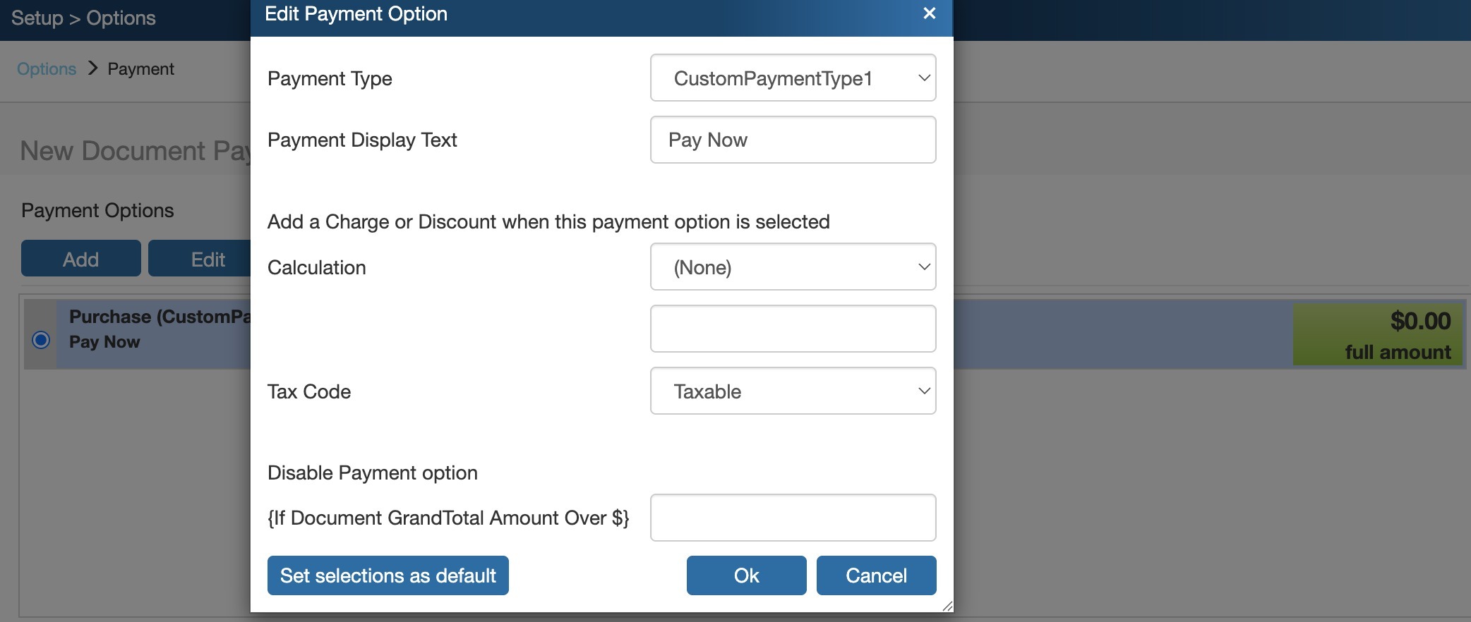 Go to Setup → Options → Payment.