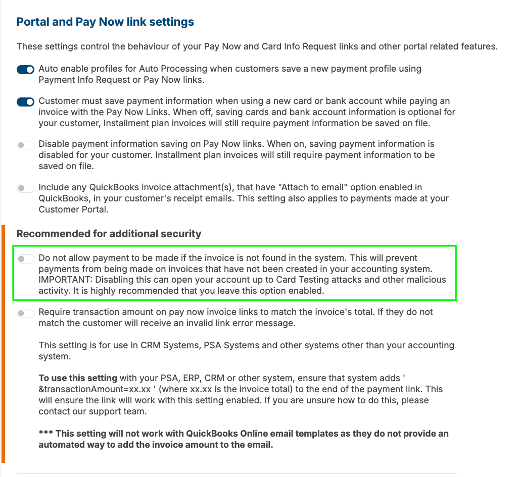 If you receive the message above, navigate to Benji Pays > Settings > Customer Portal Settings > Scroll down to Portal and Pay Now link settings > Uncheck the option "Do not allow payments to be made if the invoice is not found in the system".