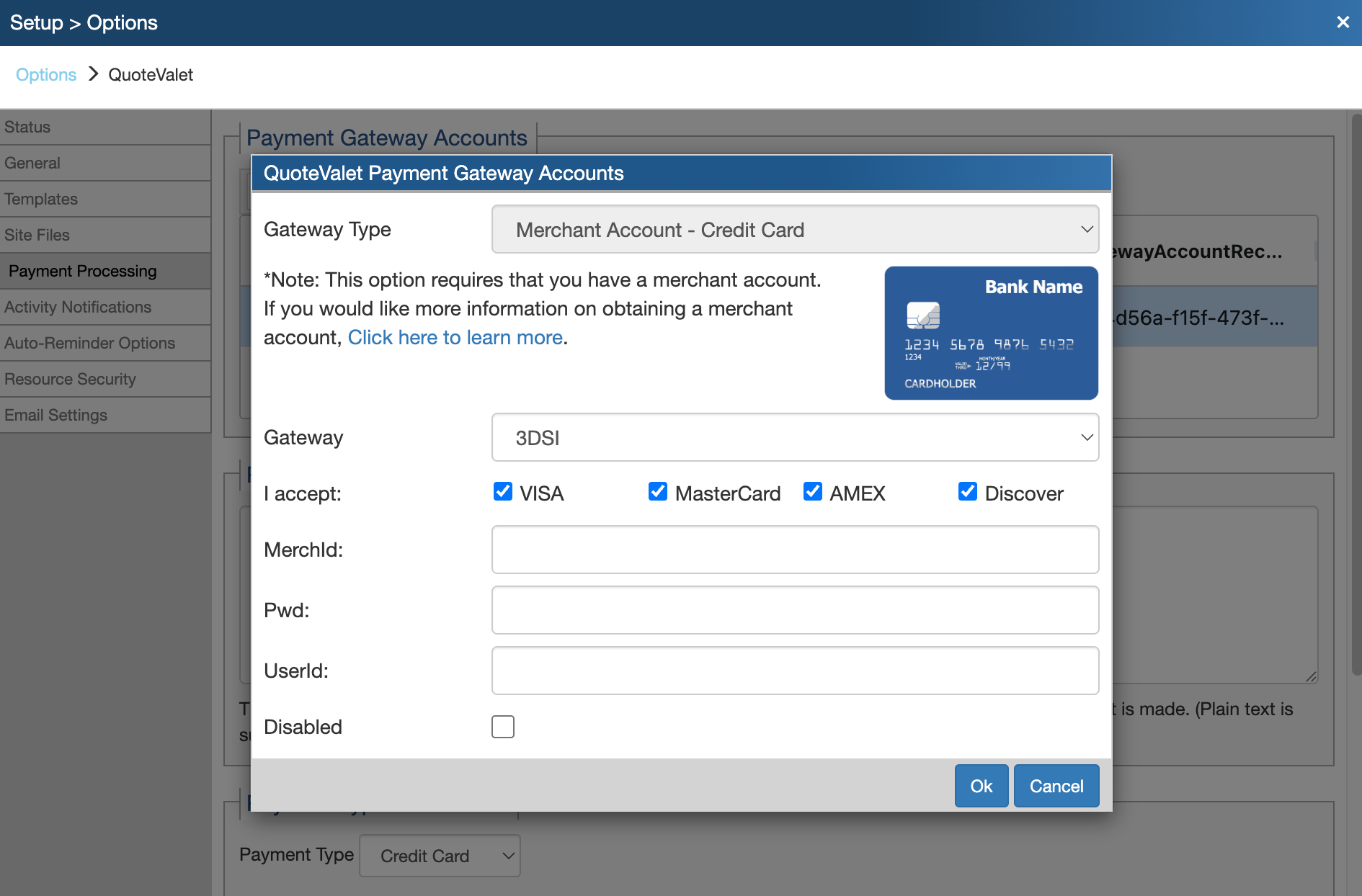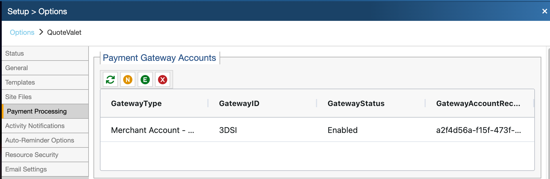 Go to Setup → Options → QuoteValet → Payment Processing.