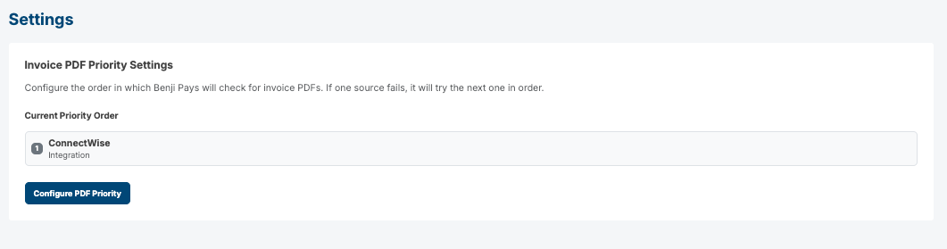 Once saved, scroll to the bottom of the Integrations page and set your Invoice PDF Priority. Click Configure PDF Priority.