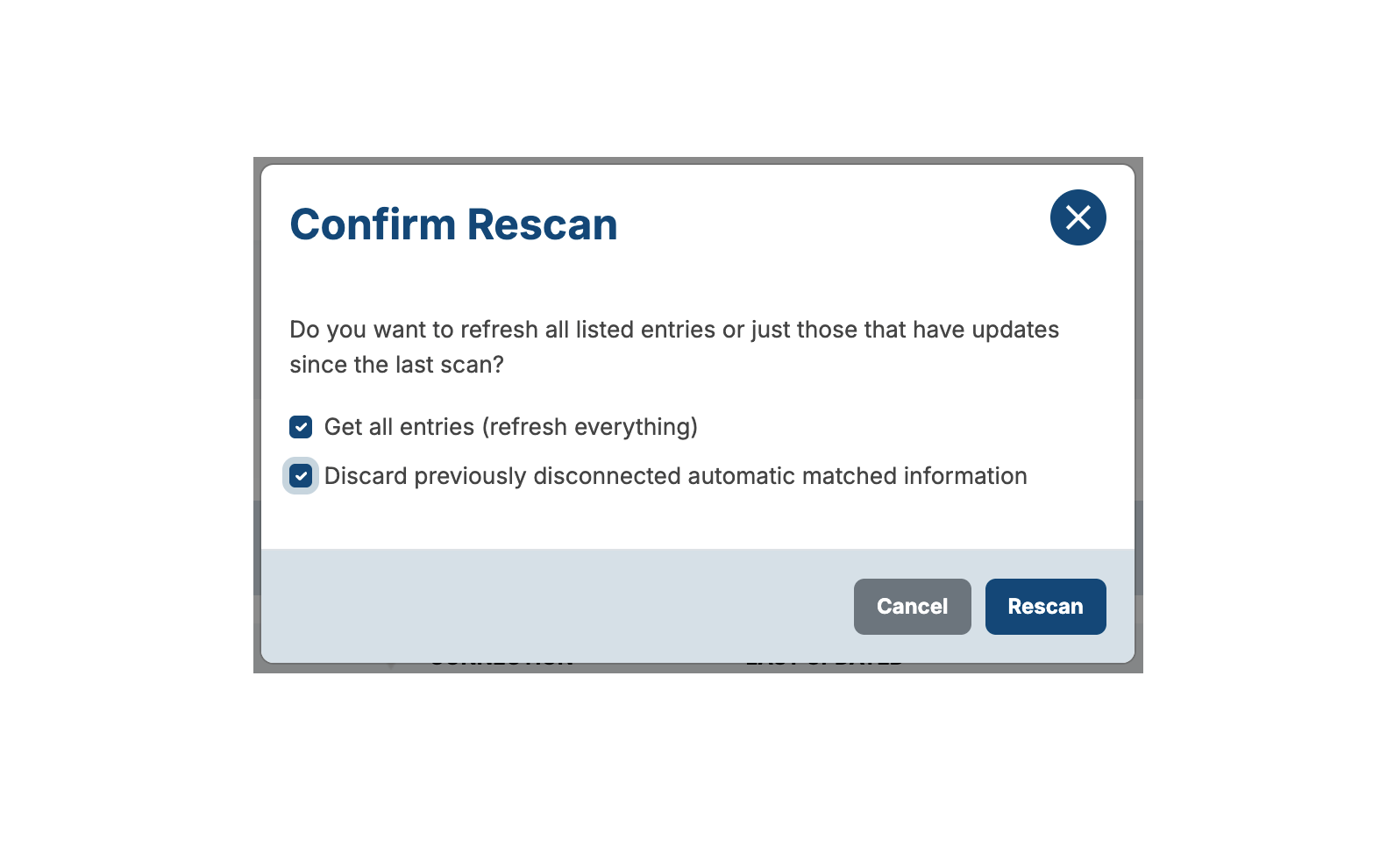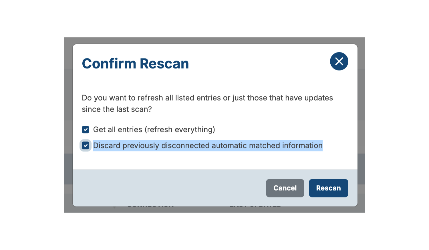 Note: Removing a mapping will prevent it from being auto-matched in future scans, unless you check the option for "Discard previously disconnected automatic matched information" in the Rescan dialog.